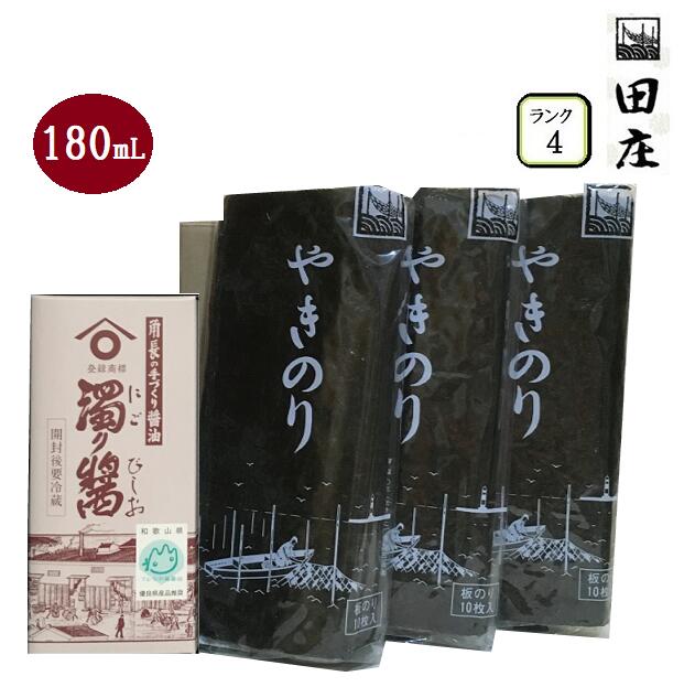 田庄 ランク4(10枚入・3パック)全型30枚 & 角長 濁り醤 にごりびしお 180ml 湯浅 醤油 (2種セット) バラ 高級 焼き海苔 田庄海苔 海苔 しょうゆ 寿司 おにぎり用 手巻き寿司 手巻きおにぎり 手土産 贈答品 父の日 2020 出産内祝い 誕生日プレゼント お礼 お返し